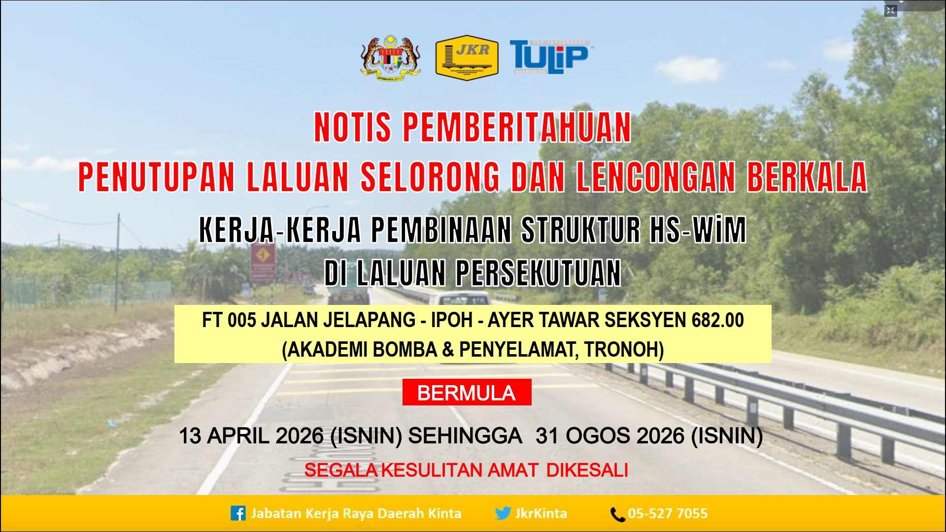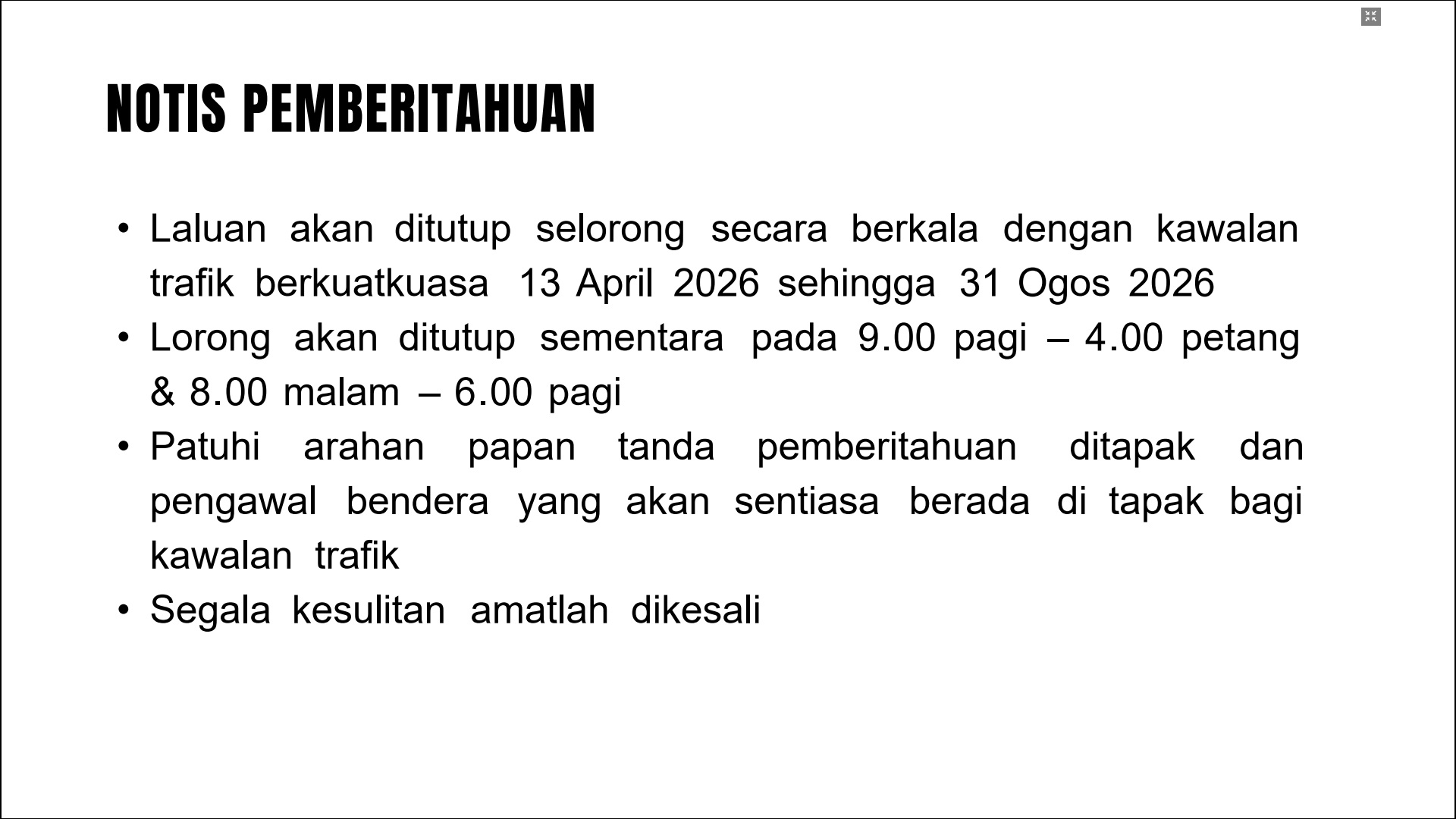 ⚠️ Laluan akan ditutup selorong secara berkala dengan kawalan trafik berkuatkuasa 13 April 2026 sehingga 31 Ogos 2026
