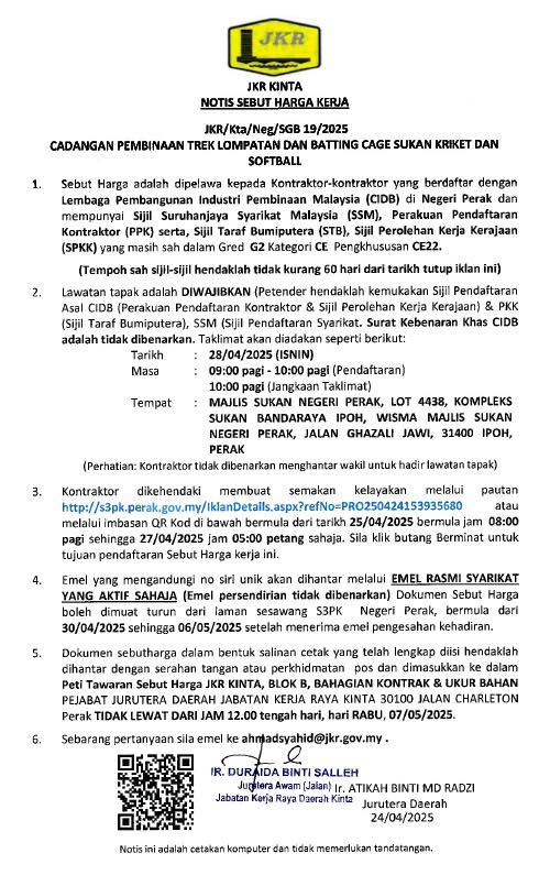 Lawatan tapak adalah DIWAJIBKAN (Penyebut harga hendaklah kemukakan Sijil Pendaftaran Asal CIDB (Perakuan Pendaftaran Kontraktor & Sijil Perolehan Kerja Kerajaan) & PKK (Sijil Taraf Bumiputera), SSM (Sijil Pendaftaran Syarikat.