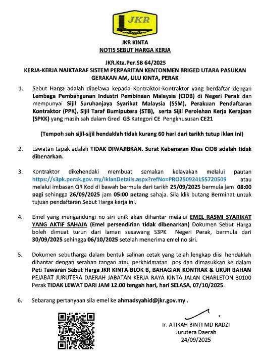 Lawatan tapak adalah DIWAJIBKAN (Penyebut harga hendaklah kemukakan Sijil Pendaftaran Asal CIDB (Perakuan Pendaftaran Kontraktor & Sijil Perolehan Kerja Kerajaan) & PKK (Sijil Taraf Bumiputera), SSM (Sijil Pendaftaran Syarikat.