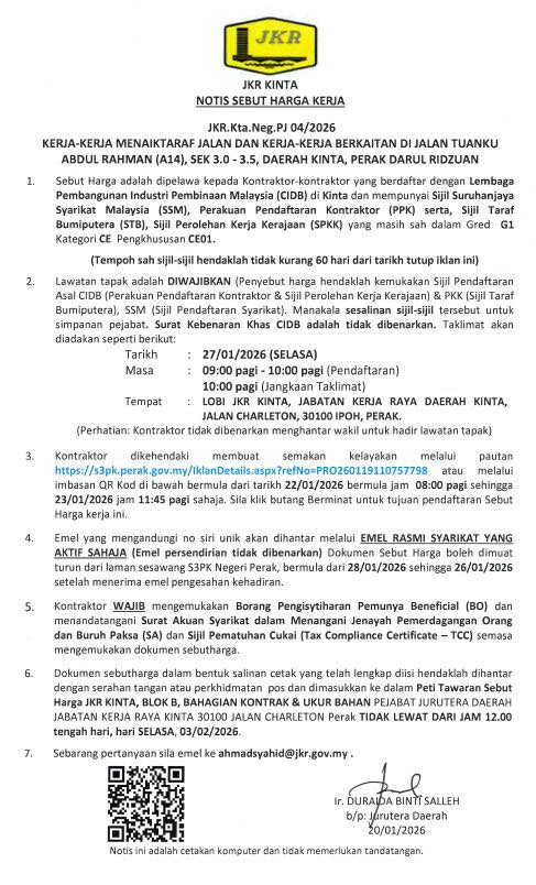 Lawatan tapak adalah DIWAJIBKAN (Penyebut harga hendaklah kemukakan Sijil Pendaftaran Asal CIDB (Perakuan Pendaftaran Kontraktor & Sijil Perolehan Kerja Kerajaan) & PKK (Sijil Taraf Bumiputera), SSM (Sijil Pendaftaran Syarikat.