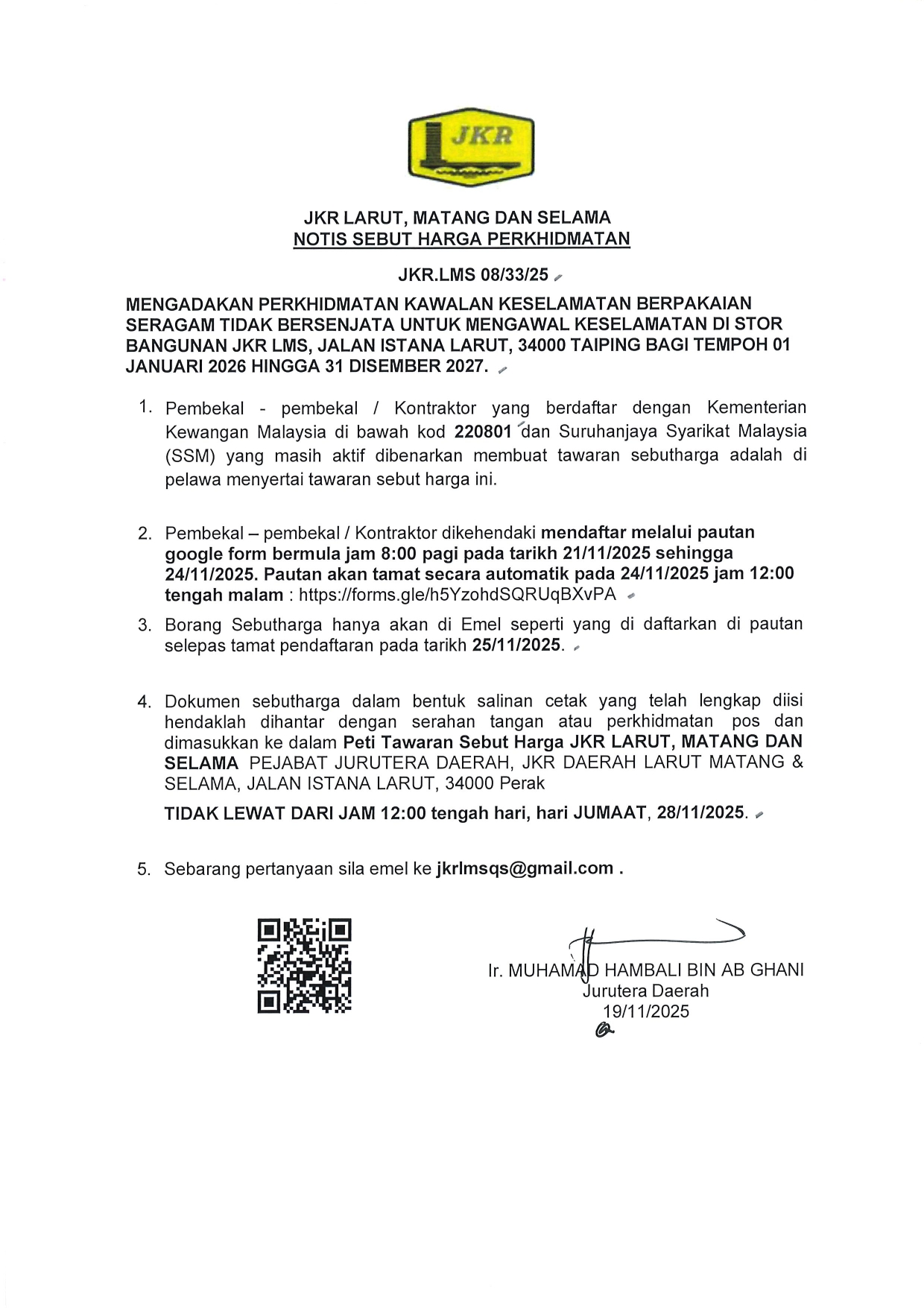 JKR.LMS 08/33/25 MENGADAKAN PERKHIDMATAN KAWALAN KESELAMATAN BERPAKAIAN SERAGAM TIDAK BERSENJATA UNTUK MENGAWAL KESELAMATAN DI STOR BANGUNAN JKR LMS, JALAN ISTANA LARUT, 34000 TAIPING BAGI TEMPOH 01 JANUARI 2026 HINGGA 31 DISEMBER 2027.