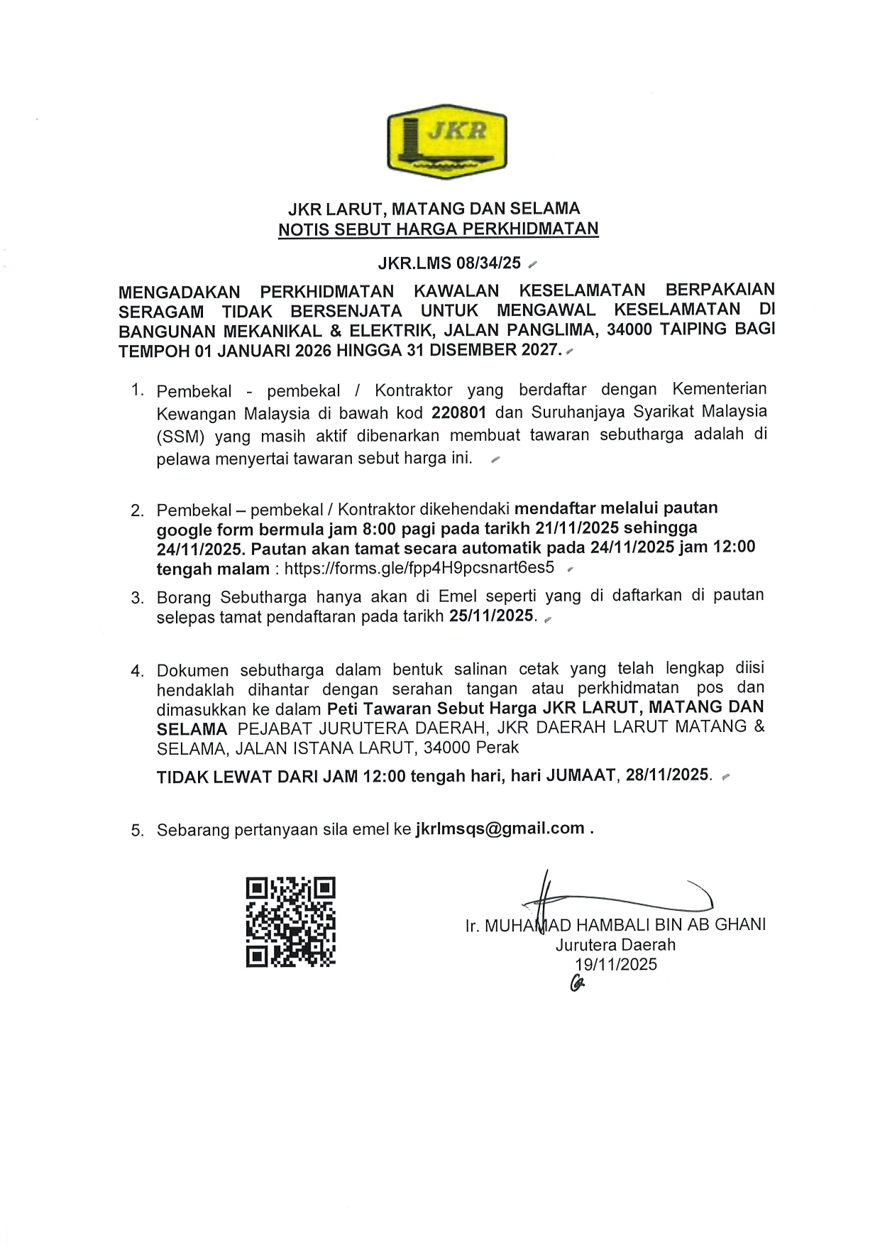 JKR.LMS 08/34/25 MENGADAKAN PERKHIDMATAN KAWALAN KESELAMATAN BERPAKAIAN SERAGAM TIDAK BERSENJATA UNTUK MENGAWAL KESELAMATAN DI BANGUNAN MEKANIKAL & ELEKTRIK, JALAN PANGLIMA, 34000 TAIPING BAGI TEMPOH 01 JANUARI 2026 HINGGA 31 DISEMBER 2027.