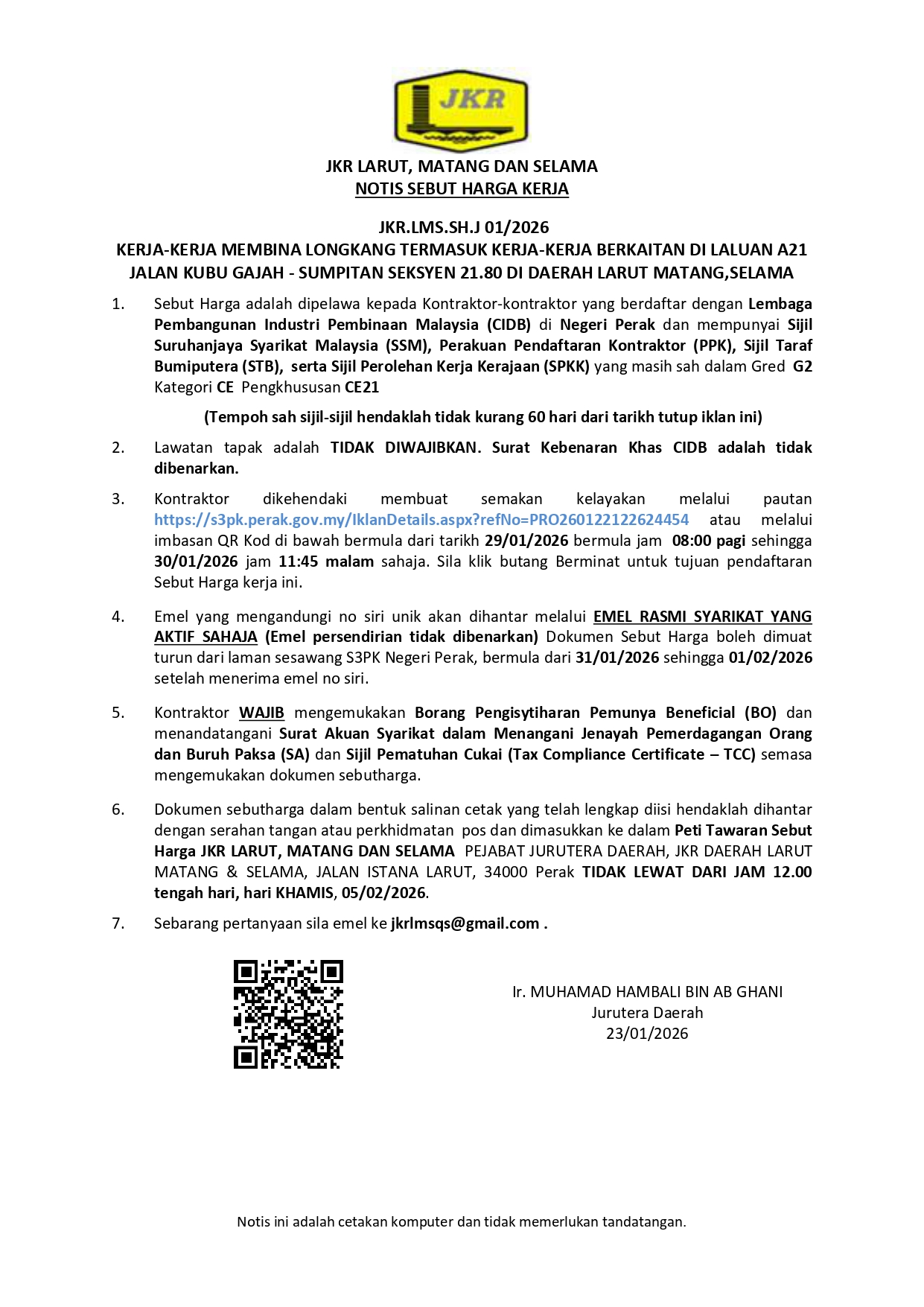 JKR.LMS.SH.J 01/2026 - KERJA-KERJA MEMBINA LONGKANG TERMASUK KERJA-KERJA BERKAITAN DI LALUAN A21 JALAN KUBU GAJAH - SUMPITAN SEKSYEN 21.80 DI DAERAH LARUT MATANG,SELAMA