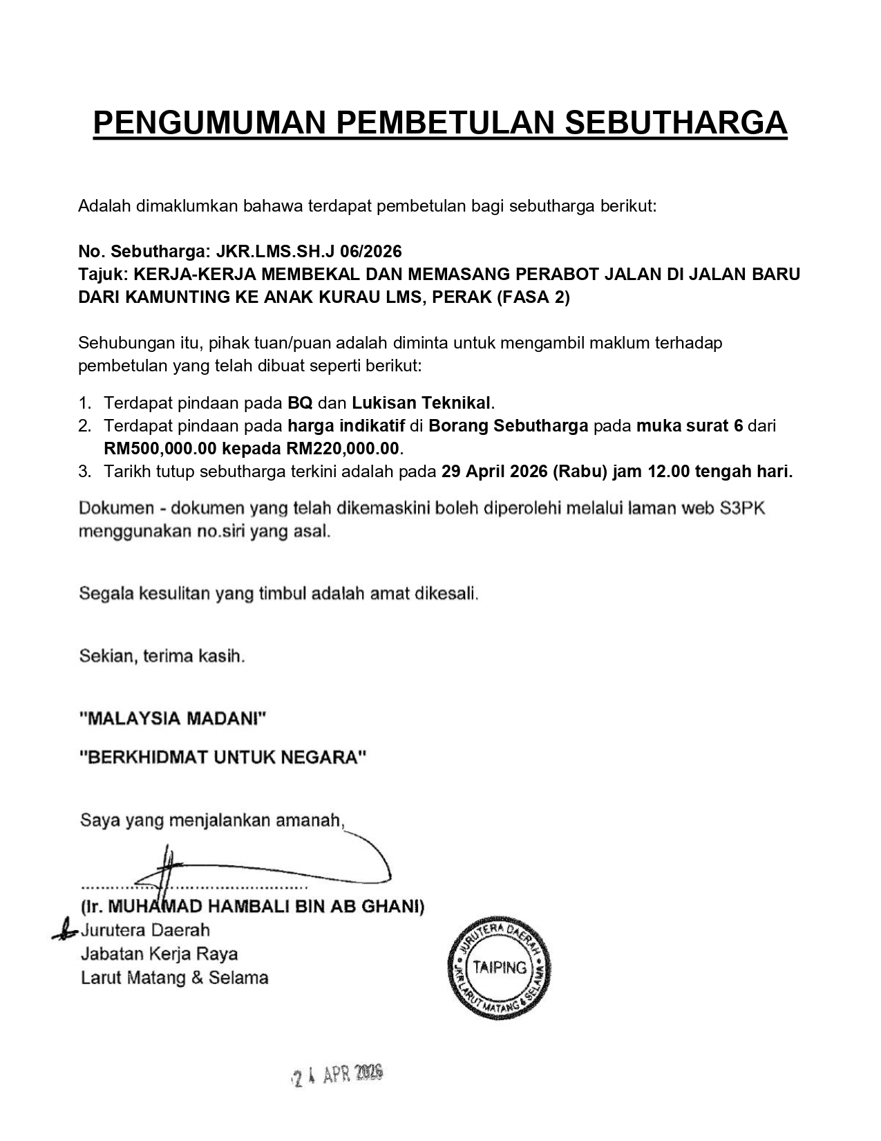 PENGUMUMAN PEMBETULAN SEBUTHARGA - JKR.LMS.SH.J 06/2026 - KERJA-KERJA MEMBEKAL DAN MEMASANG PERABOT JALAN DI JALAN BARU DARI KAMUNTING KE ANAK KURAU LMS, PERAK (FASA 2)