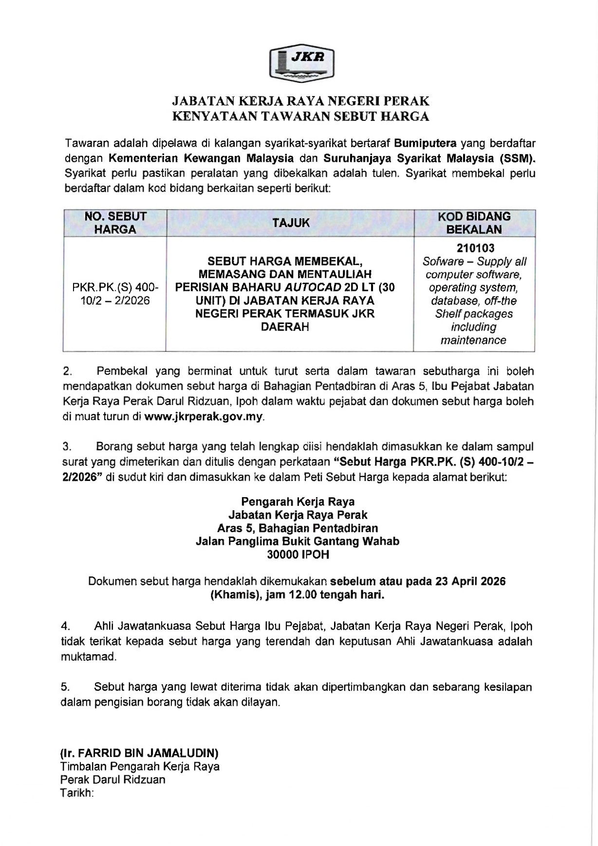 SEBUTHARGA MEMBEKAL, MEMASANG DAN MENTAULIAH PERISIAN BAHARU AUTOCAD 2D LT (30 UNIT) DI JABATAN KERJA RAYA NEGERI PERAK TERMASUK JKR DAERAH Dokumen Sebutharga boleh dimuat turun di sini: PRK.PK.(S) 400-10/2-2/2026