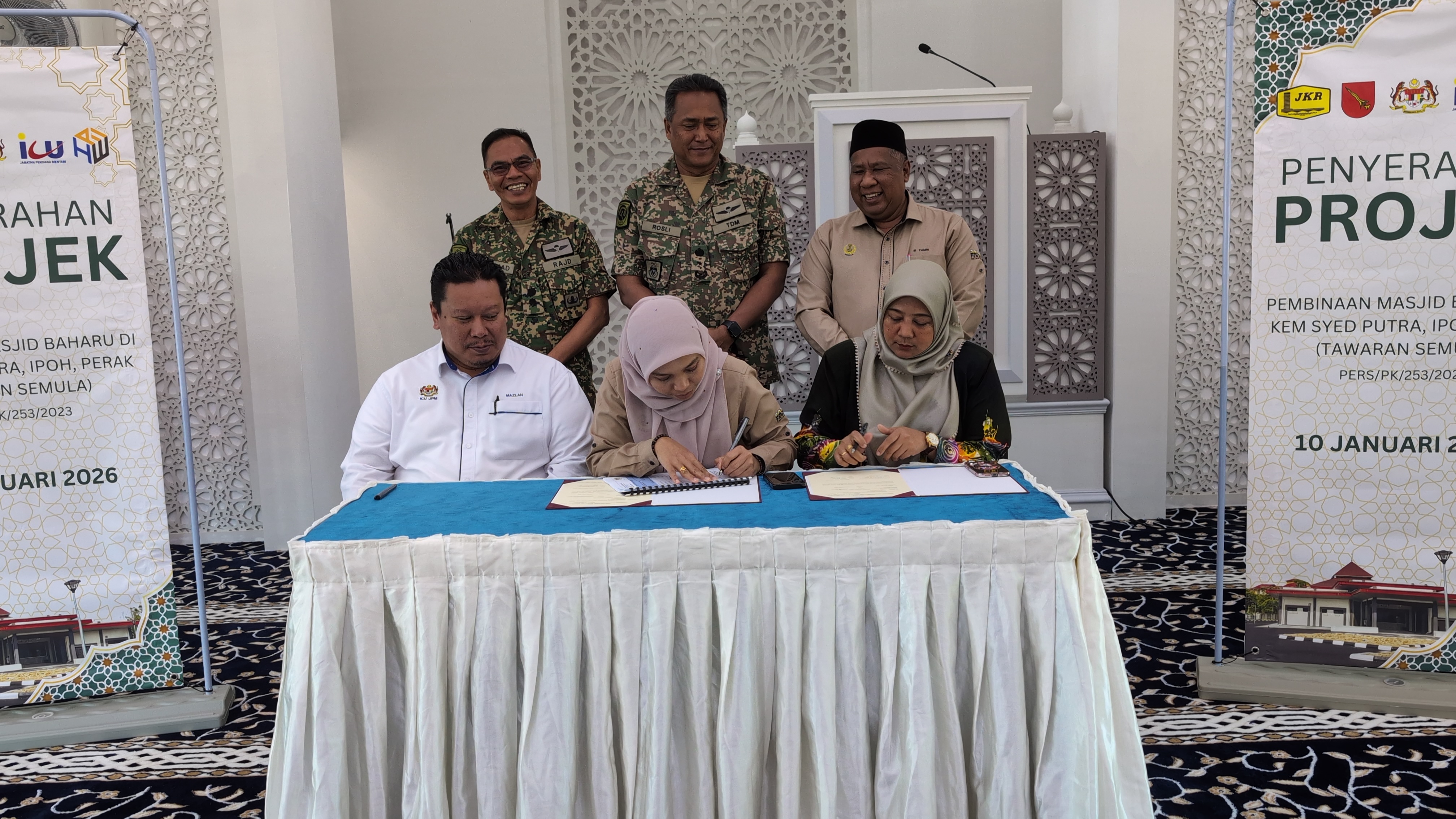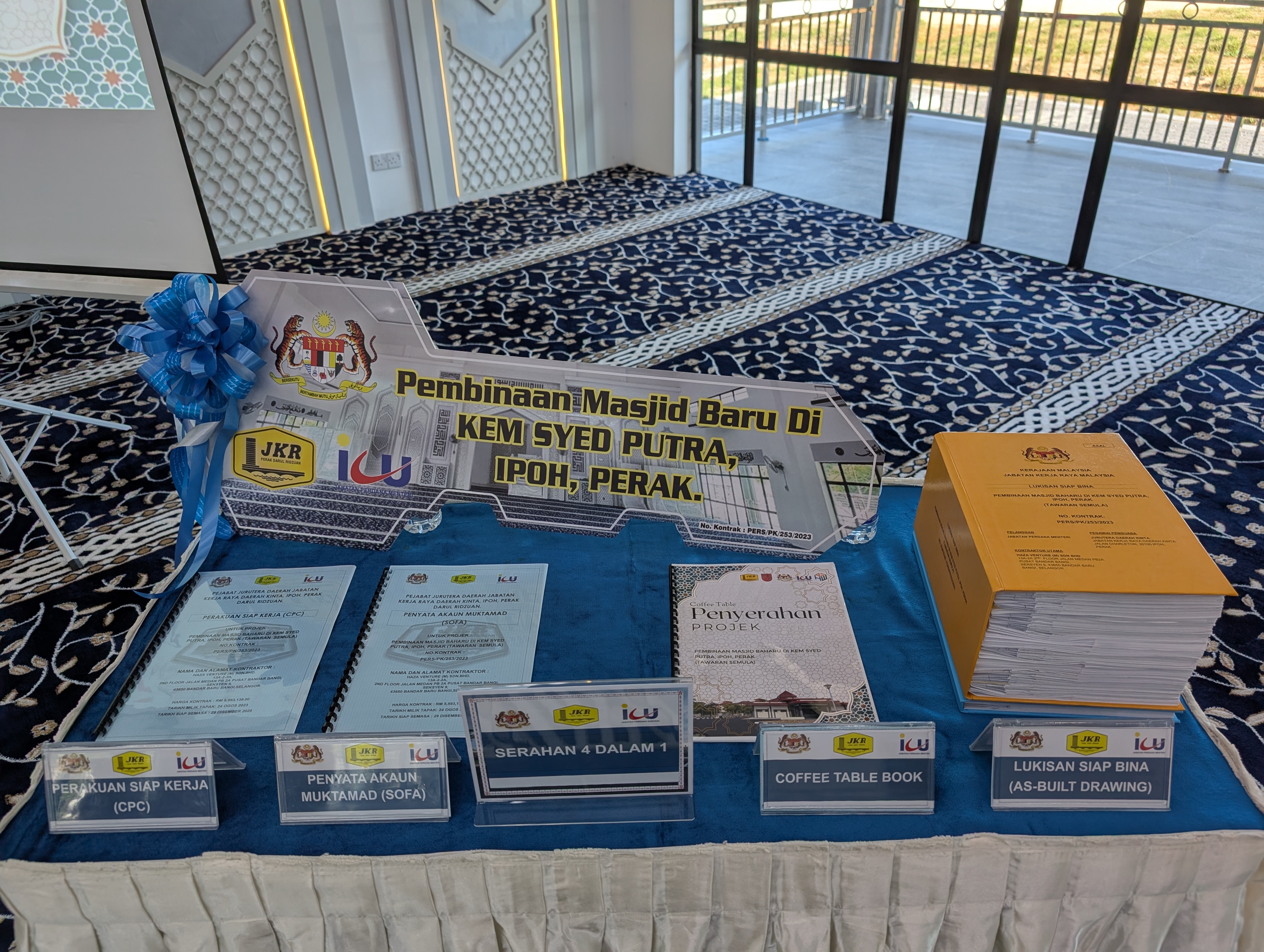 ๐Ÿญ๐Ÿฌ.๐Ÿฌ๐Ÿญ.๐Ÿฎ๐Ÿฌ๐Ÿฎ๐Ÿฒ : Program Penyerahan Projek Pembinaan Masjid Baharu di Kem Syed Putra, Ipoh Perak Darul Ridzuan. (Tawaran Semula). Penyerahan ini telah disempurnakan oleh YBrs. Ir. Haji Zamri bin Mat Kasim, Pengarah Jabatan Kerja Raya Negeri Perak kepada Tuan Mazlan Zurin Bin Zulkifli, Timbalan Pengarah Pejabat Pembangunan Negeri Perak dengan disaksikan oleh Brigedier Jeneral Datoโ€™ Mohd Rosli Bin Abu Bakar, Panglima 2 Briged dan Puan Ir. Atikah Binti Md Radzi, Jurutera Daerah JKR Kinta.