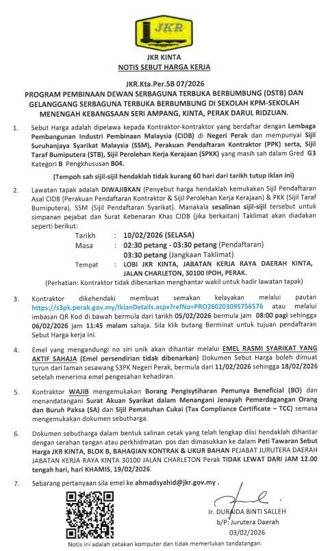 Lawatan tapak adalah DIWAJIBKAN (Penyebut harga hendaklah kemukakan Sijil Pendaftaran Asal CIDB (Perakuan Pendaftaran Kontraktor & Sijil Perolehan Kerja Kerajaan) & PKK (Sijil Taraf Bumiputera), SSM (Sijil Pendaftaran Syarikat.