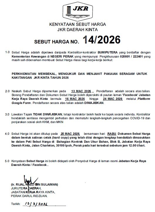 Borang Pendaftaran & Muat turun Dokumen Sebut Harga boleh diperolehi di pautan Laman Facebook JKR DAERAH KINTA melalui Platform '๐๐ข๐ข๐๐๐ ๐๐ข๐ฅ๐ '.ย