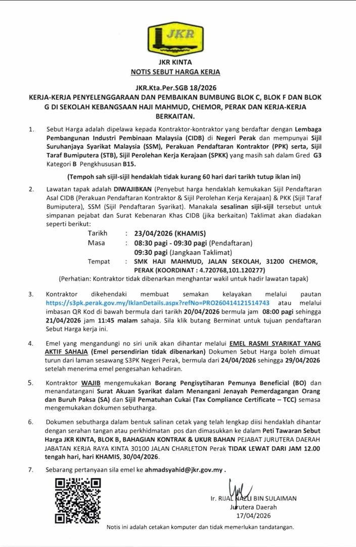 Lawatan tapak adalah DIWAJIBKAN (Penyebut harga hendaklah kemukakan Sijil Pendaftaran Asal CIDB (Perakuan Pendaftaran Kontraktor & Sijil Perolehan Kerja Kerajaan) & PKK (Sijil Taraf Bumiputera), SSM (Sijil Pendaftaran Syarikat.