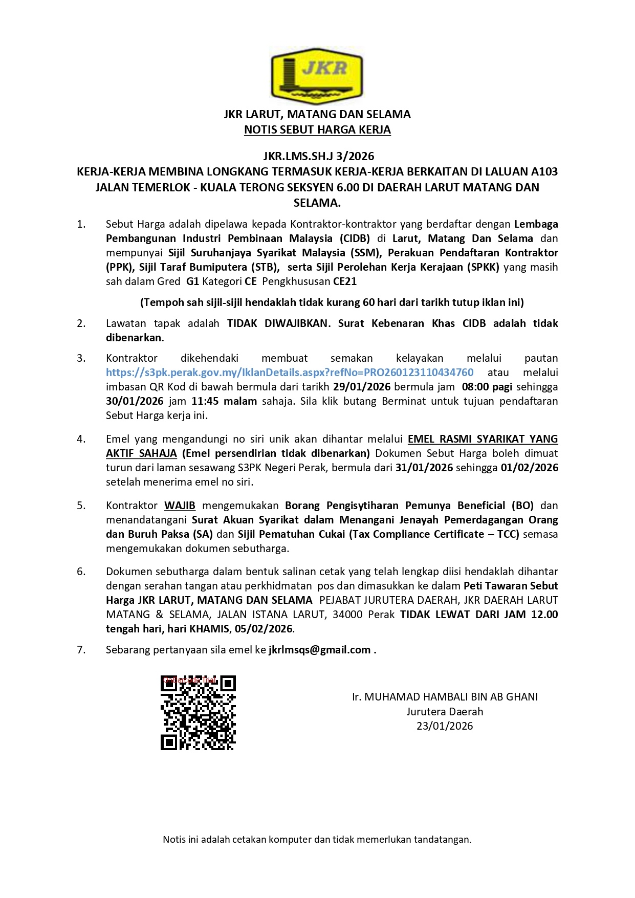 JKR.LMS.SH.J 3/2026 - KERJA-KERJA MEMBINA LONGKANG TERMASUK KERJA-KERJA BERKAITAN DI LALUAN A103 JALAN TEMERLOK - KUALA TERONG SEKSYEN 6.00 DI DAERAH LARUT MATANG DAN SELAMA.