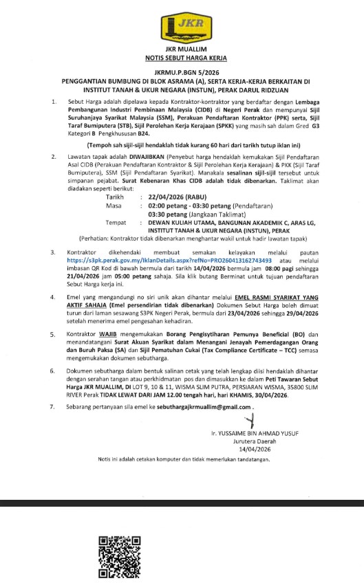 PENGGANTIAN BUMBUNG DI BLOK ASRAMA (A), SERTA KERJA-KRJA BERKAITAN DI INSTITUT TANAH & UKUR NEGARA (INSTUN), PERAK